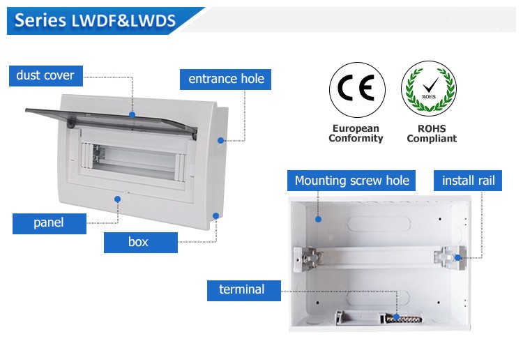 This is Merlin Gerin type distribution box which can be equipped with various modular electrics for the function of terminal power distribution.