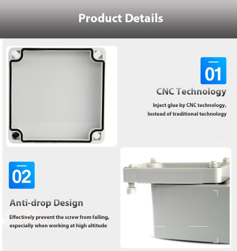 It is made of materials such as ABS and PS,with elegant external apprearance and firm performance.Cover and bottom are combined by screws.The weight of plastic enclosure is the quarter of iron enclosure.